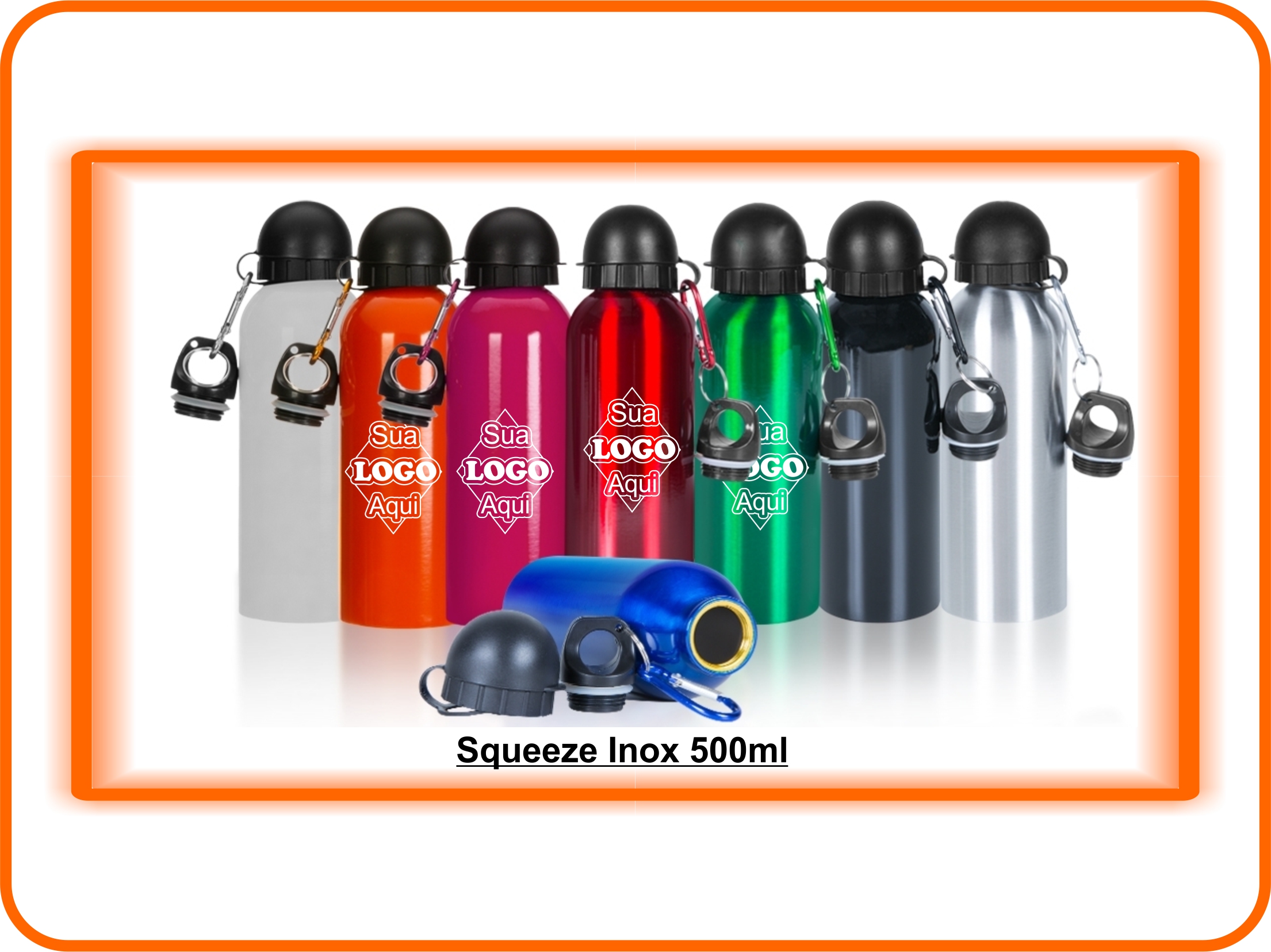 Descrição: Squeeze 500ml de inox com pintura metalizada, tampa rosqueável e acompanha um segundo bico com mosquetão (não é térmico).